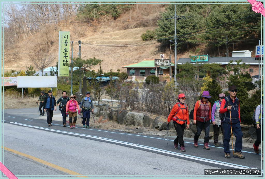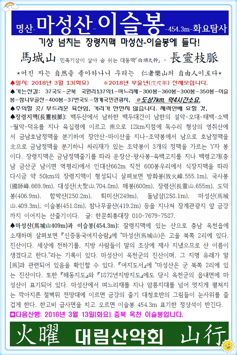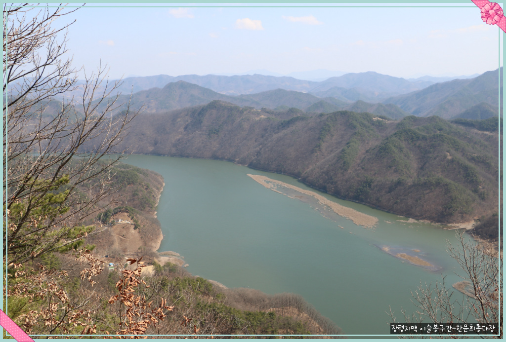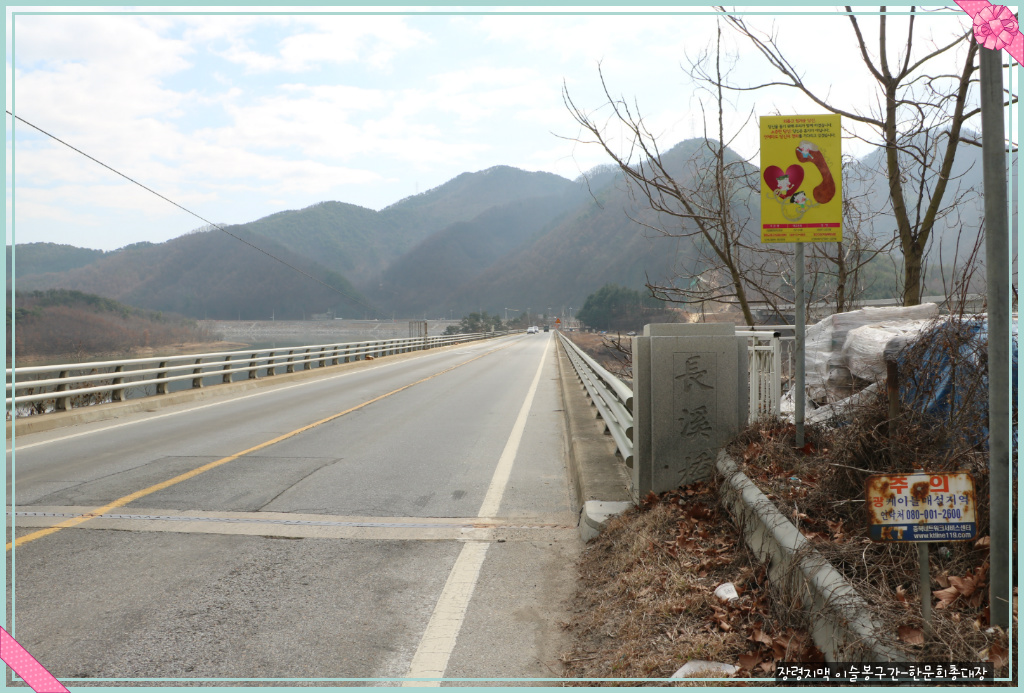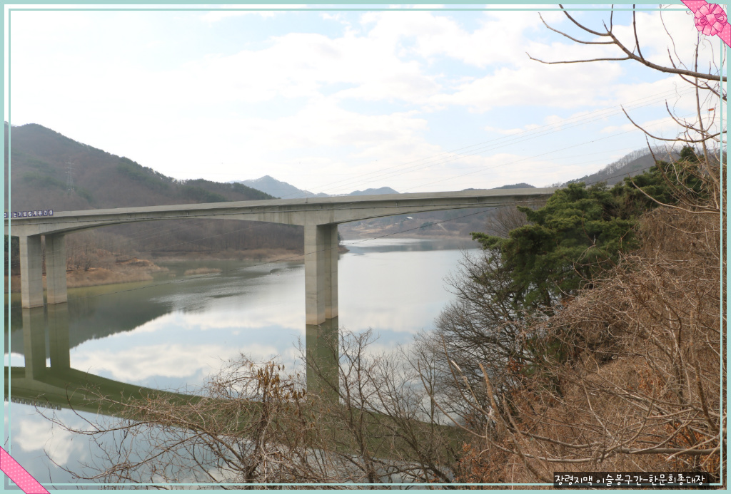 > 대청호반과 금강, 장계교: 충북 옥천군 안내면 장계리78번지, 장령지맥 끝자락 이곳에서 더 나아갈 수 없습니다. 우리는 장계국민관광지에서 11시 들머리를 합니다. 11시 장계리 장계교 앞에서 들머리 산행을 시작합니다. 오늘은 산우회 1년 무사기원을 축원하는 산제를 모시는 날입니다. 12시 참나무골산에서 숨을 가다듬고 이슬봉으로 향합니다. 장령지맥의 개요는 상(개요) 참고바랍니다 옥천의 산그림자가 대청호반과 어울려 그림처럼 풍광이 빛나옵니다. 장령지맥이며 대청호반의 대청호오백리 트레일 길입니다. 장령지맥 이슬봉입니다. 양편으로 대청호 금강이 흐르고 있습니다. 출발하여 1시간38분 소요되었습니다. 돌고 돌아도 가도 뒤를 돌아보아도 호반은 계속 이어집니다. 며느리재에 도착하니 14시 이곳에서 오늘 산제가 있어 나머지구간은 다음으로 기약하고 서운하지만 전원 충북 군북면 국원리로 하산을 합니다. 며느리재에서 하산하면 군북면 국원리158-1 시골토종닭 043-733-9673입니다. 백년손님과 진수성찬(군북면 국원리113-4) 이 있있습니다. 무술년 무사산행을 기원하는 산제를 모십니다. 정성을 다하여 산제를 모시는 대림산우회 가족들, > 일곱번 쓰러져도 일어서는 인생길 나그네길이 흐릅니다. 수고들 하셨습니다. 인생길 나그네길/ 라훈아 자유인산악회 한문희총대장 |