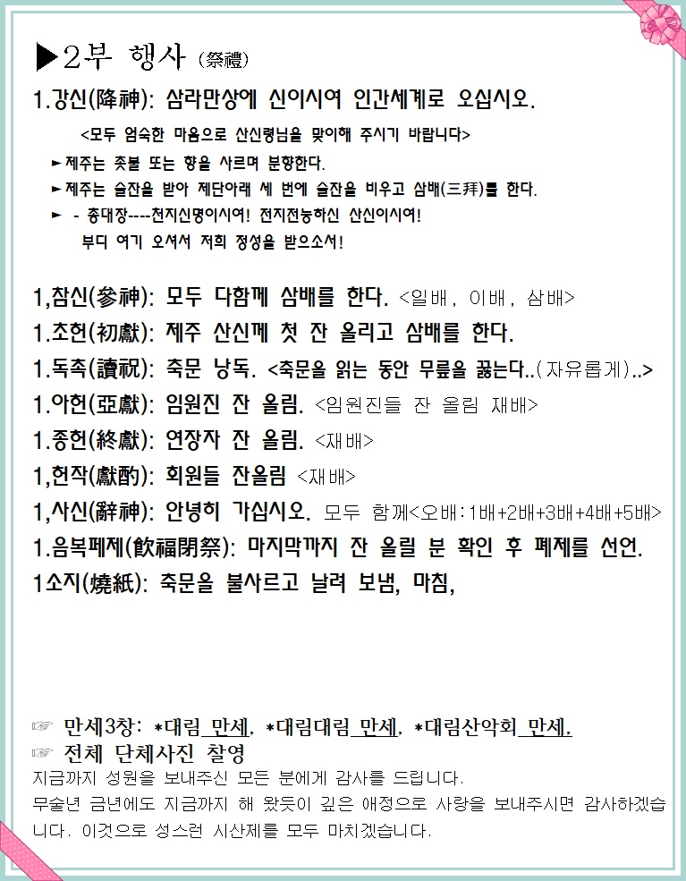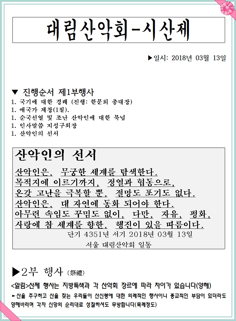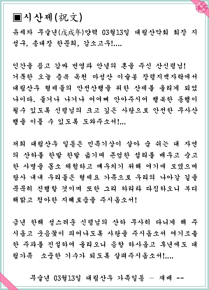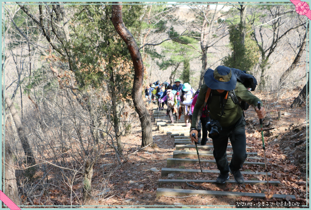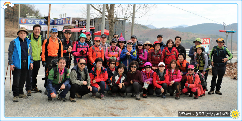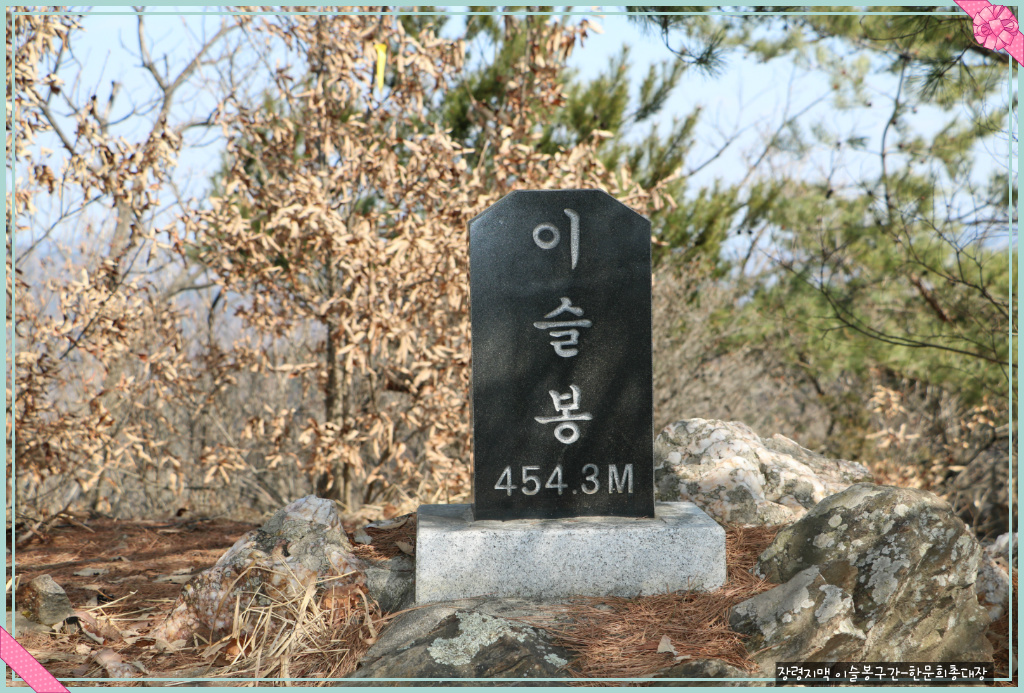 > 대청호반과 금강, 장계교: 충북 옥천군 안내면 장계리78번지, 장령지맥 끝자락 이곳에서 더 나아갈 수 없습니다. 우리는 장계국민관광지에서 11시 들머리를 합니다. 11시 장계리 장계교 앞에서 들머리 산행을 시작합니다. 오늘은 산우회 1년 무사기원을 축원하는 산제를 모시는 날입니다. 12시 참나무골산에서 숨을 가다듬고 이슬봉으로 향합니다. 장령지맥의 개요는 상(개요) 참고바랍니다 옥천의 산그림자가 대청호반과 어울려 그림처럼 풍광이 빛나옵니다. 장령지맥이며 대청호반의 대청호오백리 트레일 길입니다. 장령지맥 이슬봉입니다. 양편으로 대청호 금강이 흐르고 있습니다. 출발하여 1시간38분 소요되었습니다. 돌고 돌아도 가도 뒤를 돌아보아도 호반은 계속 이어집니다. 며느리재에 도착하니 14시 이곳에서 오늘 산제가 있어 나머지구간은 다음으로 기약하고 서운하지만 전원 충북 군북면 국원리로 하산을 합니다. 며느리재에서 하산하면 군북면 국원리158-1 시골토종닭 043-733-9673입니다. 백년손님과 진수성찬(군북면 국원리113-4) 이 있있습니다. 무술년 무사산행을 기원하는 산제를 모십니다. 정성을 다하여 산제를 모시는 대림산우회 가족들, > 일곱번 쓰러져도 일어서는 인생길 나그네길이 흐릅니다. 수고들 하셨습니다. 인생길 나그네길/ 라훈아 자유인산악회 한문희총대장 |