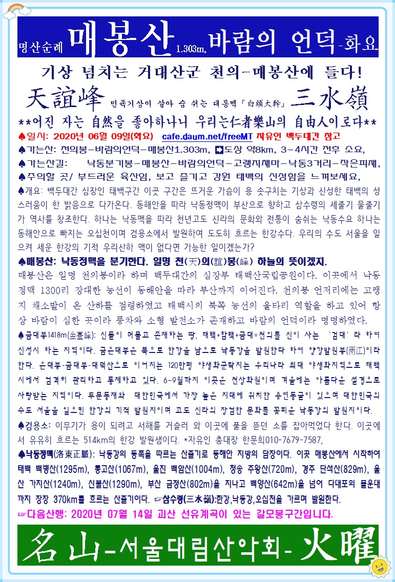 > > > <태백>-백두대간+낙동정맥의 매봉산 바람의 언덕+황지연못을 찾아서 - 01, > > 모두 수고들 하셨습니다. 백두대간 전문탐사팀 자유인산악회(한문희총대장) 백두대간23기종주대는 2019년 4월7일부터~2020년12월20일까지 50구간=(당일37+무박13)으로 진행, 제24기는 2020년 6월 14일 시작~22년 5월 8일 종료하는 일정입니다. 백두대간+정맥을 20여년간 전문으로 탐사하며 500여명이 대종주를마첬으며 종주자들로 구성된 정맥팀 1진이 70여개 지맥 탐사를 2기정맥종주대는 정맥을 마치고 기맥+지맥을 하고 있습니다. 자유인 낙동정맥3기종주대는 2020년 5월10일 시작하여 21년 4월11부산 몰운대에서 종료합니다. 자유인으로서 선배 기수들의 뒤를 이어 백두대간+정맥 전설의 팀으로 초심을 잃지 않고 거듭 나겠습니다. 이에 백두와 정맥에 관심있는 동지들 대 환영하오니 많은 홍보와 성원 부탁드립니다. 한문희총대장 올림, 자세한일정및 정보는 다음카페-자유인산악회 카페- 백두대간, 정맥방을 참고바랍니다. 영상물 보신 느낌은 좋으시다면!.. 멘트 하소절 남기시면 복 받는답니다. <명화주제곡>- '사랑과 영혼' 外 15選 ♪자유인산악회/한문희총데장- |