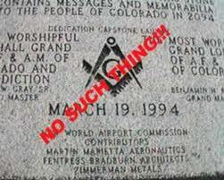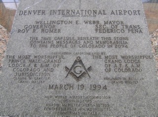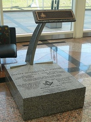 공항터미널‘그레이트·홀’바닥에 개항기념 석판이 설치되어 있는데 실제로 존재하지 않는 신세계공항위원회(New World Airport Commission)명의의 그 위 키패드에 프리메이슨(Freemason)의 심볼 마크가 그려져 있다는 것이다. 석판 밑에는 100년 후인 2094년에 열 수 있도록 한 타임캡슐이 설치돼있으며 콜로라도 인들에게 전하는 메시지가 들어가 있다. 프리메이슨이란, ‘세계의 정치·종교·조직의 통합’을 외치는 최대비밀결사단체로, 로마 가톨릭교회가 ‘악마의 회당’으로 적대시하고 있다.