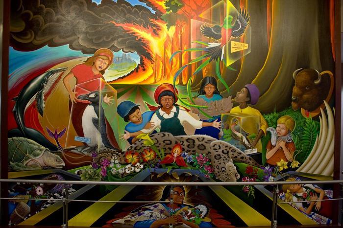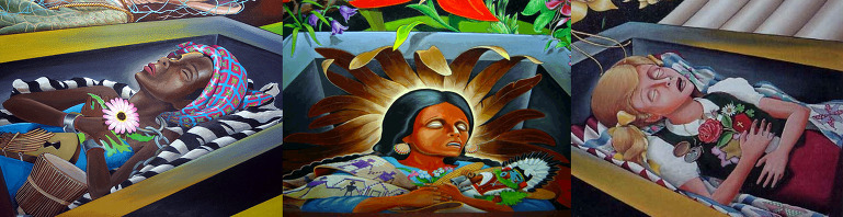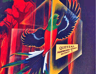 벽화 상단 우측에 있는 새(위 좌측그림)를 보면 그 의미가 보다 정확하게 해석됩니다. 유리 상자 안에 갇힌 새의 이름은 '케찰(QUETZAL)'이구요. 이 새는 과테말라의 국조이며 '왕의 임재', '왕권'을 상징합니다. '죽은 표범과 유리 안에 갇힌 왕의 새' 이 새는 이미 첫번째 벽화(위 우측그림)에서 등장하셨죠. 새는 여인과 표범과 더불어 잘 나갈 때는 세상을 다 얻은 듯이 펄 펄 그리며 온 나라 사람들의 위에서 군림하여 기세등등했었으나, 진실은 대리인이지요. 그래서 그 허상은 허상일 뿐이라는 예정된 일에 대한 대리인에 대한 경고의 뜻일 수도 있겠네요.