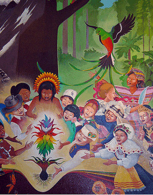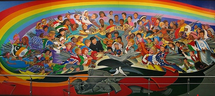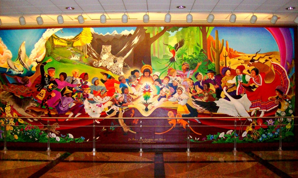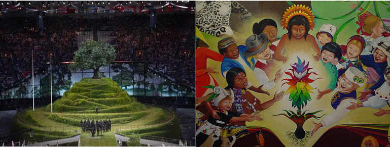 배경이 언뜻 보기에는 지구 여기 저기를 그려놓은 것 같지만 실상은 현 지구의 고통스런 형편을 보여주고 있습니다. 특히 좌측 상단 끝에는 고래가 신음하고 있고, 우측 상단 끝에는 가뭄과 기근으로 황폐해지고 메말라가며 신음하고 있는 지구의 현 상황을 잘 보여주고 있습니다.그러한 상황에서 인류는 세계 모든 각양 각색의 인종들이 모이는 '세계인 축제의 날'은 흥분과 기쁨속에서 열리지요. 아마도 올림픽, 월드컵, 엑스포 정도의 행사가 되겠네요. 하지만 가장 큰 규모의 행사는 올림픽이고 가운데에는 뭔가 이 그림의 가장 중심적인 의미를 상징하는 '나무'가 있는데요. 다섯 색깔(빨강, 파랑, 초록, 노랑, 검정)의 나무, 흰색을 검정색으로 놓고 보면 올림픽의 5륜의 색깔과 일치하므로 올림픽 행사로 보는 것이 가장 유력하겠고, 특히 이것을 무지개 형태라고 본다면 이 상징의 '무지개'를 테마로 하는 올림픽은 바로 2012년 지금 열심히 치루어 지고 있는 런던 올림픽(LONDON OLYMPIC)이 되겠네요. 게다가 이번 행사때 '생명의 나무'라고 하면서 거대한 이상한 나무를 선보였죠.