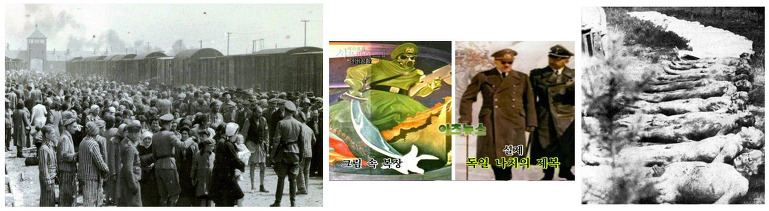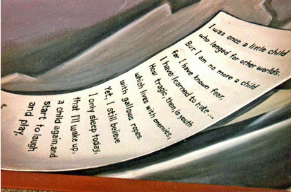 그 조작된 테러와 전쟁을 통해 수많은 사람들이 고통받고, 고아들이 생겨날 것과 평화(비둘기)는 이 땅에서 없어질 것이다 라는 것으로 해석됩니다. 이 '아랍인의 칼로 세상을' 그림의 우측 하단에 보면 편지가 하나 있습니다. 이는 아우슈비츠 수용소(Auschwitz: 폴란드 남부의 도시로 비르케나우 수용소에서 2차대전 당시 약 400만명의 유대인과 헝가리, 폴란드인이 학살되었음)에 있었던 어느 소년이 남긴 편지의 내용을 구지 강조하여 그림으로써 뭔가 강한 설명과 암시를 하고자 한다고 볼 수 있습니다. 그 소년이 다음 세상을 위해 돌아와 그 미움을 다시 돌려준다는 것(복수, 2012년 런던올림픽 행사곡 뮤즈의 가사내용에 있지요)을 강조하고 있습니다.