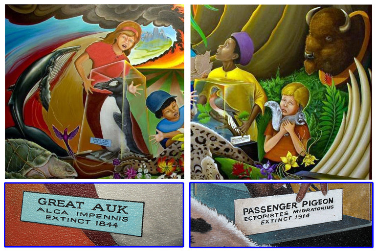 그레이트 오크(Great Auk)는 펭귄처럼 생긴 '큰바다오리'로 해양 생물류에 속하구요, 페신저 비둘기(Passenger Pigeon)은 온 하늘을 뒤덮을 만큼 많았는데 지금은 둘 다 멸종된 상태입니다. 즉, 해양동물, 육지동물, 조류, 식물 할 것 없이 상당한 종류의 생물이 멸종하고 고통당하고 신음할 것임을 의미합니다. 여기 그림의 우측에 나오는 박제된 소의 머리를 악마의 상징으로 보는 사람들도 있지만 제가 보기에는 소의 박제, 코끼리들의 상아 등을 상징한다고 보면 육지 생물도 거의 멸종되거나 포획된다는 것으로 보는 것이 타당할 것 같네요. <위의 우측의 그림에서 상아처럼 생긴 것을 성경에서의 '뿔' 7개를 의미하며 이는 곧 살아남은 세력이라고 보고, 관은 제거된 세력으로서 초기 10개의 뿔(나라)중에서 대적하는 나라(3개의 나라)의 멸망이라고 보기도 합니다>