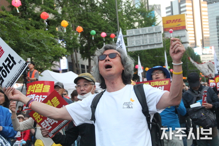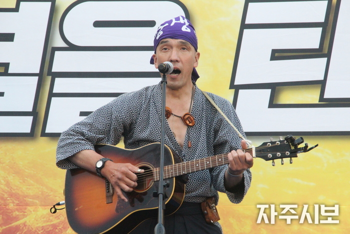 ▲ 집회에 참석한 일본인 미기타 다카시 씨가 정리집회에서 노래 공연을 했다 . © 이인선 기자 |