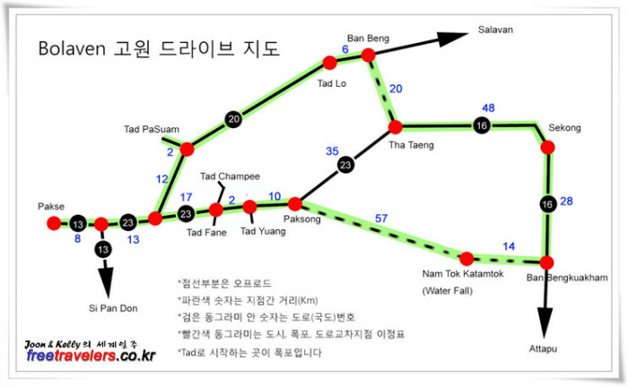 이후에 우리처럼 오토바이 여행을 할 사람들을 위해 이 지역 지도를 만들어 보았습니다. 물론 팍세에서 오토바이 빌릴 때 비슷한 지도를 구할 수 있을 것입니다. 연두색으로 표시한 부분이 우리가 달렸던 길입니다. 라오스에서의 오토바이 여행, 오토바이 초보자들은 힘들겠지만(비포장이 많아서) 운전 경험이 있는 분이라면 꼭 권하고 싶습니다.