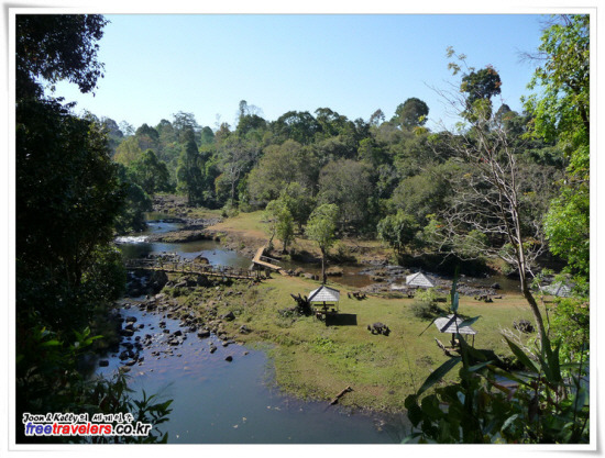 이곳은 관광객들이 많이 오는지 들어가는 길은 험한 비포장 도로지만 들어가면 입구에 상점들이 많습니다. 호텔 같은 객실도 좀 있습니다. 내려가는 길은 폭포 위쪽이고 거기서부터 폭포 아래까지 계단이 만들어져 있습니다. 폭포 위쪽에는 공원처럼 예쁘게 리조트를 만들어 두었습니다. 저기 보이는 나무 다리들을 건너면 폭포 위쪽에서 아래로 떨어지는 물줄기를 볼 수 있습니다.