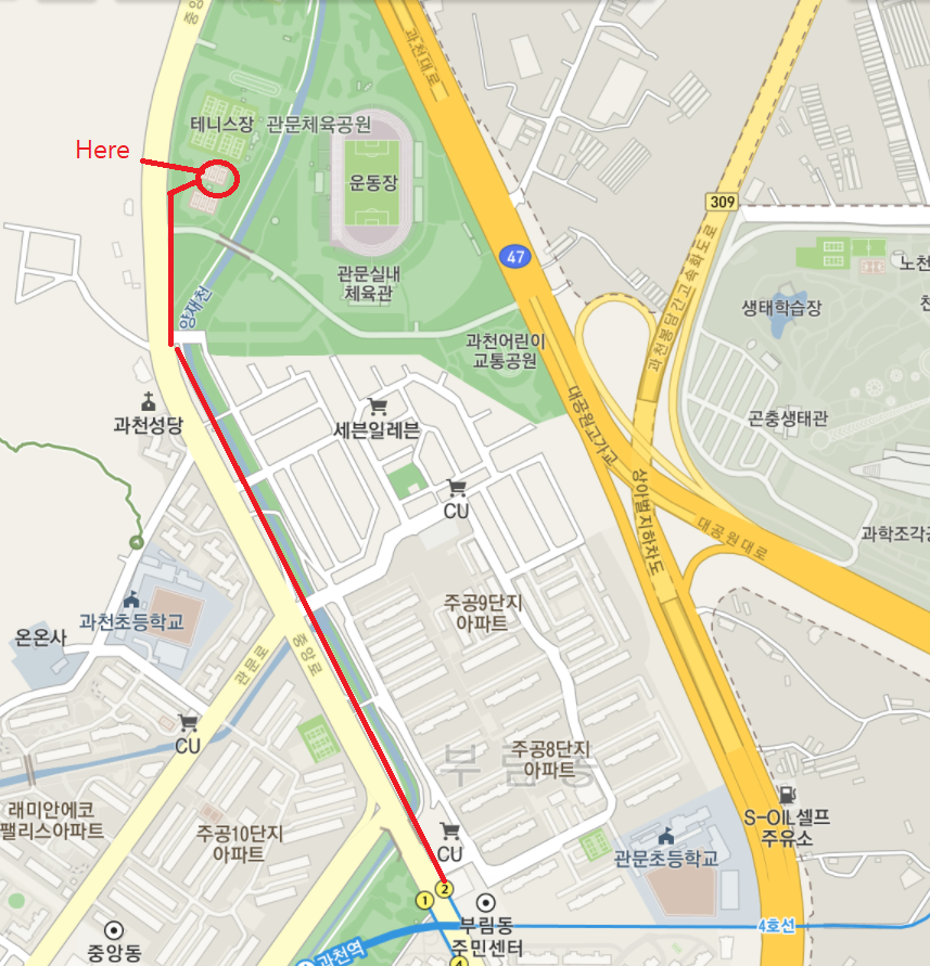 1. 4호선 과천역 2번 출구에서 과천관문체육공원 방향으로 걷기(약 900m)