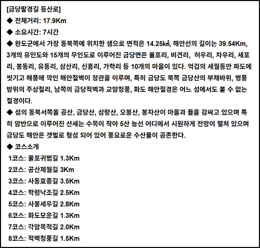 C:울포선착장-금당면사무소-금당복지회관-차우고개-공산138-금당산178-너럭암릉-물탱크-동막재-삼랑산219-오봉산186-세추목삼거리-율포선착장(13km/5시간)