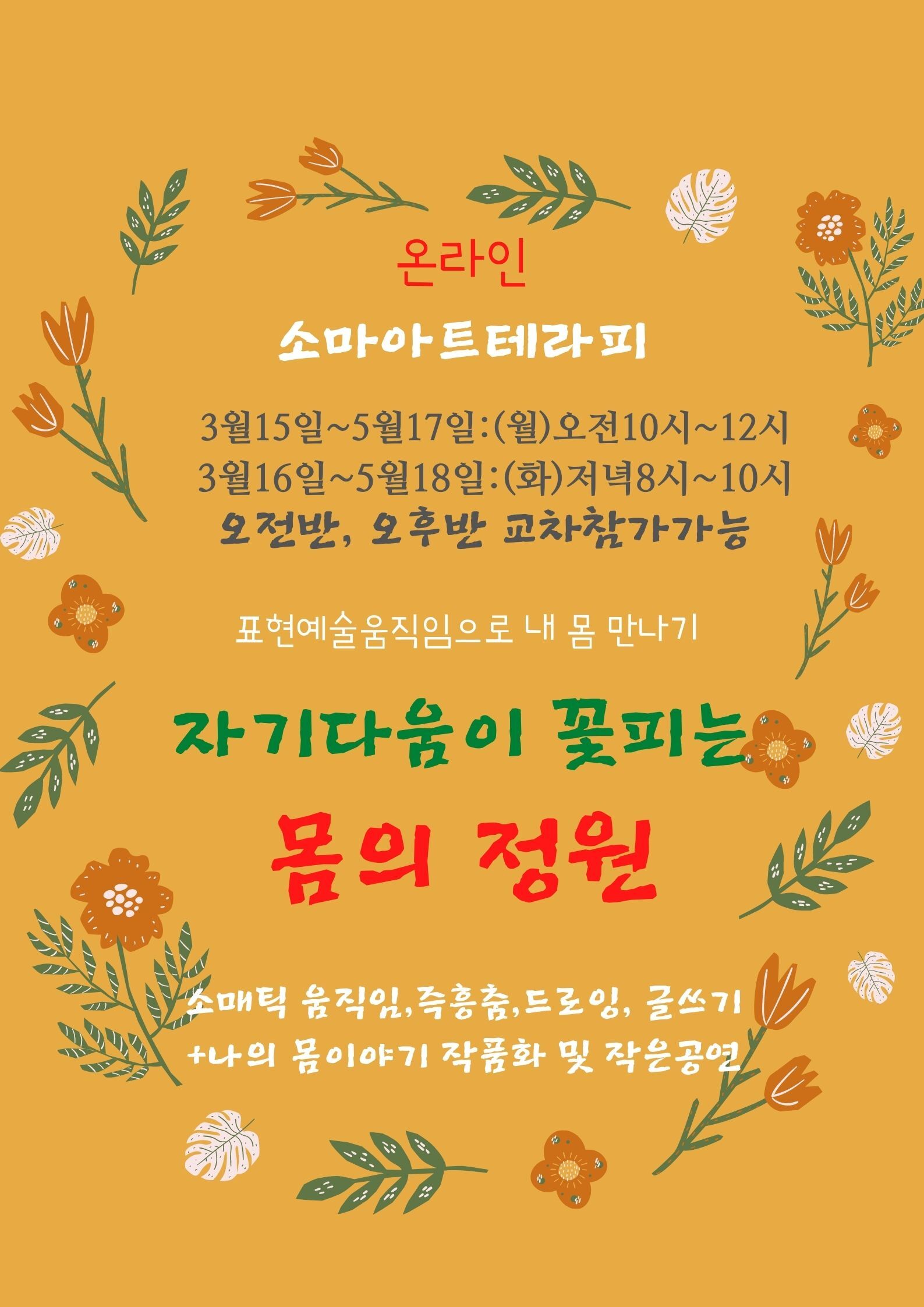 몸의 정원을 가꾸는 일은 마음의 정원을 가꾸는 일이자 내 삶의 정원을 가꾸는 일이고, 매순간 나 자신을 창조하며 사는 일입니다. 내 몸이 들려주는 이야기를 섬세하게 들으며 나를 더 깊이 만나고, 흙속에 묻혀있는 나의 색깔과 방향의 씨를 발견하여 한송이 꽃으로, 나무로, 풀로 고고하게 키워내고 싶은 사람들을 초대합니다.