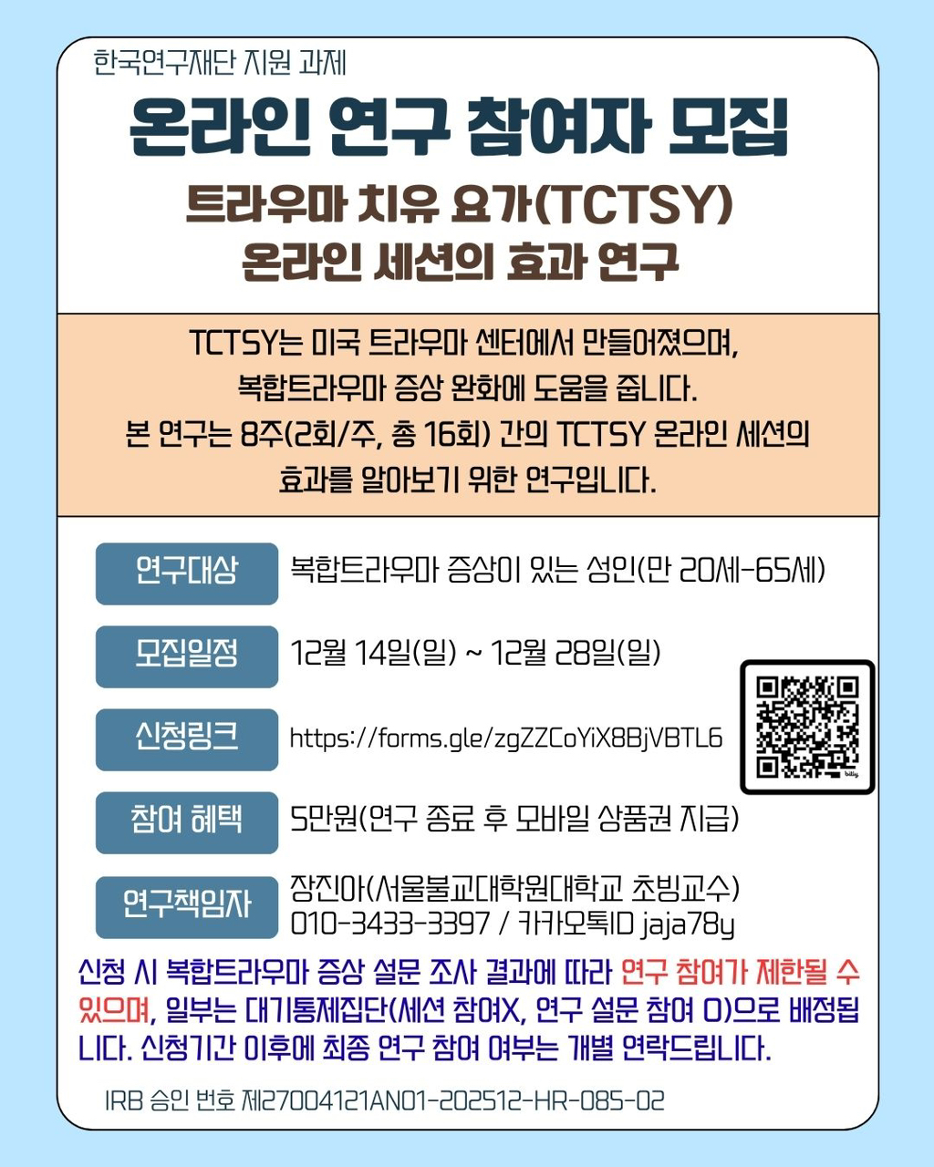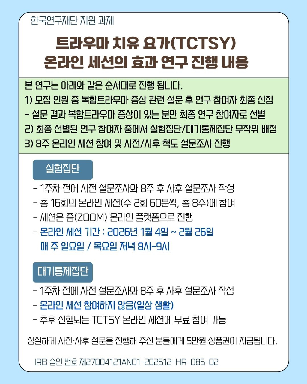 ‘트라우마 치유 요가(TCTSY) 온라인 세션의 효과 연구’ 참여자 모집을 진행합니다!!!