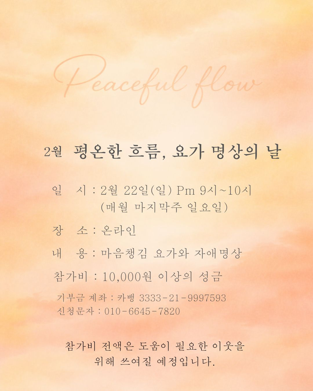 매월 마지막 주 일요일에는 자애명상으로 자애의 마음을 나누고, 필요한 분들께 물질도 함께 나누는 시간을 마련하고자 합니다. 첫 번째 시간이 2월 22일 진행됩니다. 나눔으로 내가 얼마나 충만해질 수 있는지 경험하고 싶은 분들을 초대합니다.