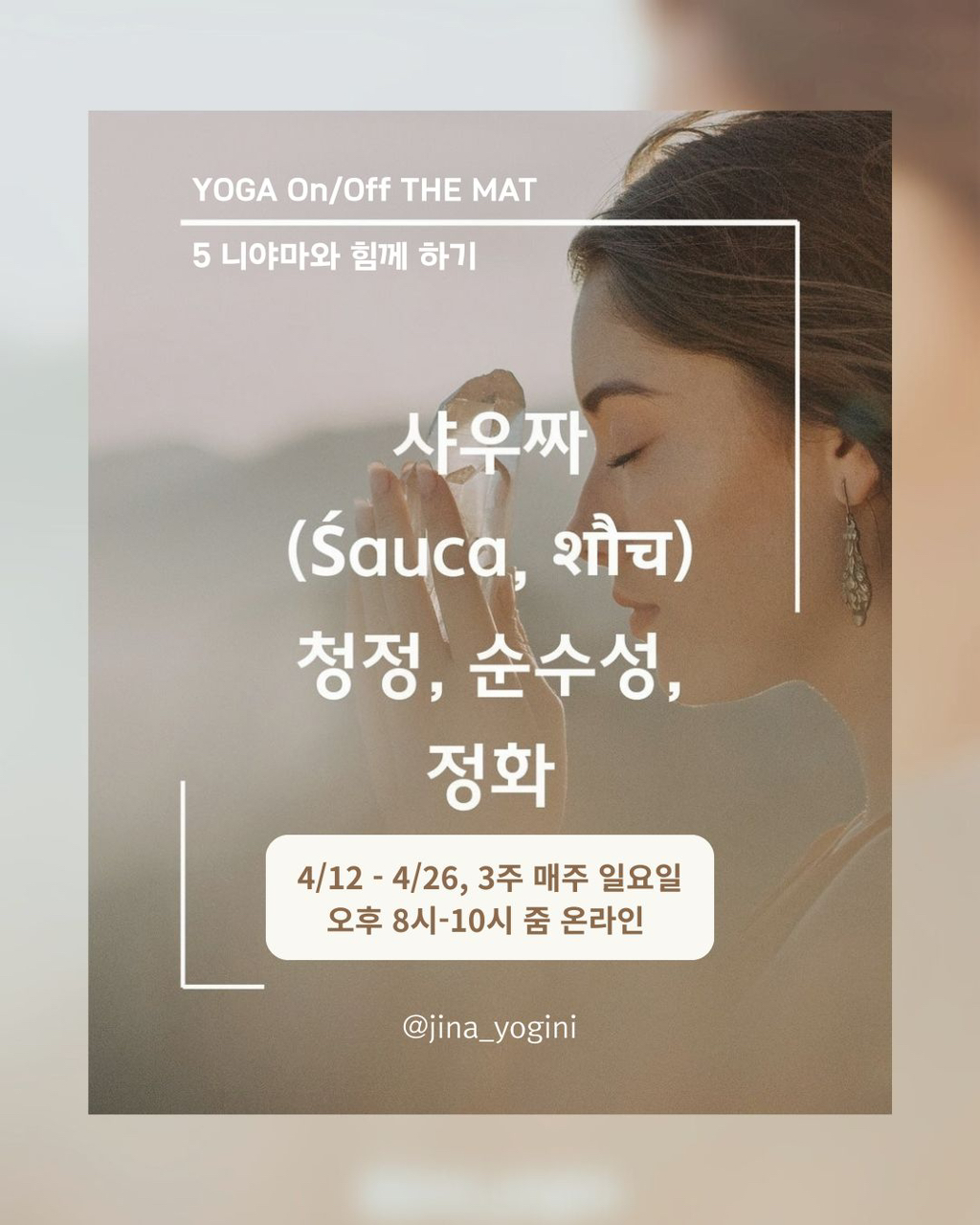 이번에는 매 월 5개의 니야마 중 하나의 주제를 정하여 자신의 삶을 돌아보고, 요가 수련 뿐 아니라 일상 생활에 적용할 수 있는 방법에 대해 같이 공부하고 수련하며, 적용해 볼 예정입니다.