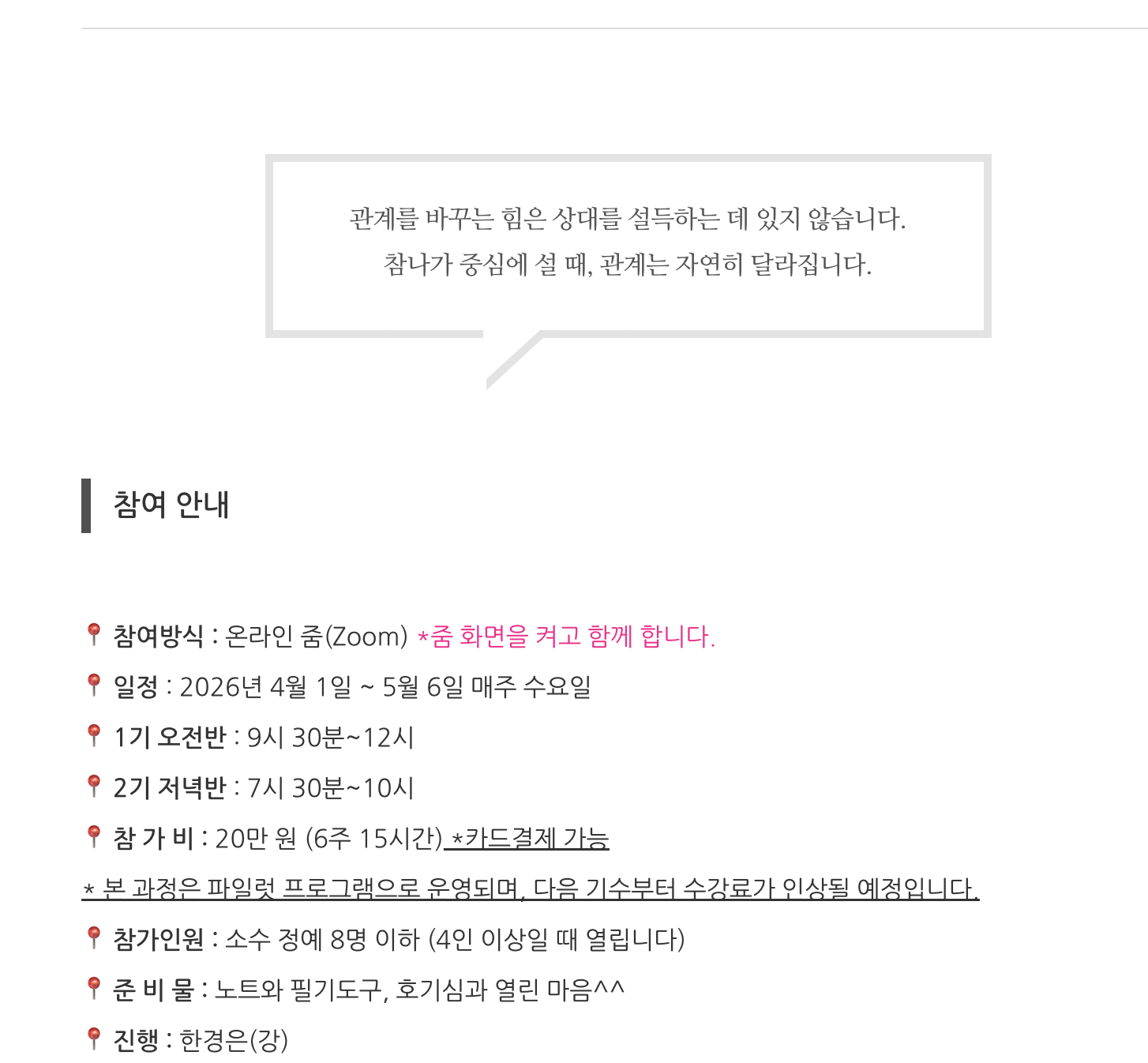 참여안내와 개강공지 등 모두 이 톡에서 이루어집니다. (개별적으로 연락드리지 않아요)