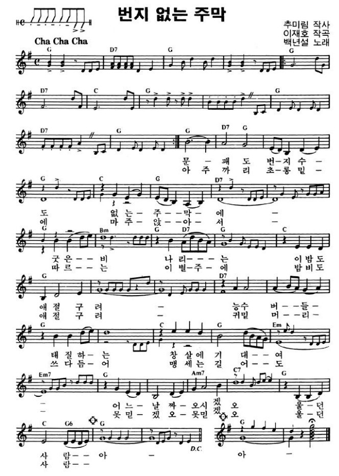 [스크랩] 번지없는 주막 악보 - 백년설 노래 작성자송인영|작성시간12.12.11|조회수2,294 목록 댓글 1 글자크기 작게가 글자크기 크게가 번지없는 주막 악보 - 백년설 노래 다음검색 스크랩 원문 : 7080뭉게구름 현재 게시글 추가 기능 열기 북마크 공유하기 신고 센터로 신고 댓글 댓글 1 댓글쓰기 답글쓰기 댓글 리스트 작성자정완교 | 작성시간 13.01.19 인쇄하여 잘보고 연습하고 있습니다. 음계도 보지않고 칠수 있도록 다 외웠습니다.그러나 음절이 끈어지고 특히 화음은 전혀 넣지를 못하니 언제가야 제대로 흉내라도 낼 수 있을지 한심 하기도 하지만 ,그래도 즐겁기는 합니다. 댓글 전체보기