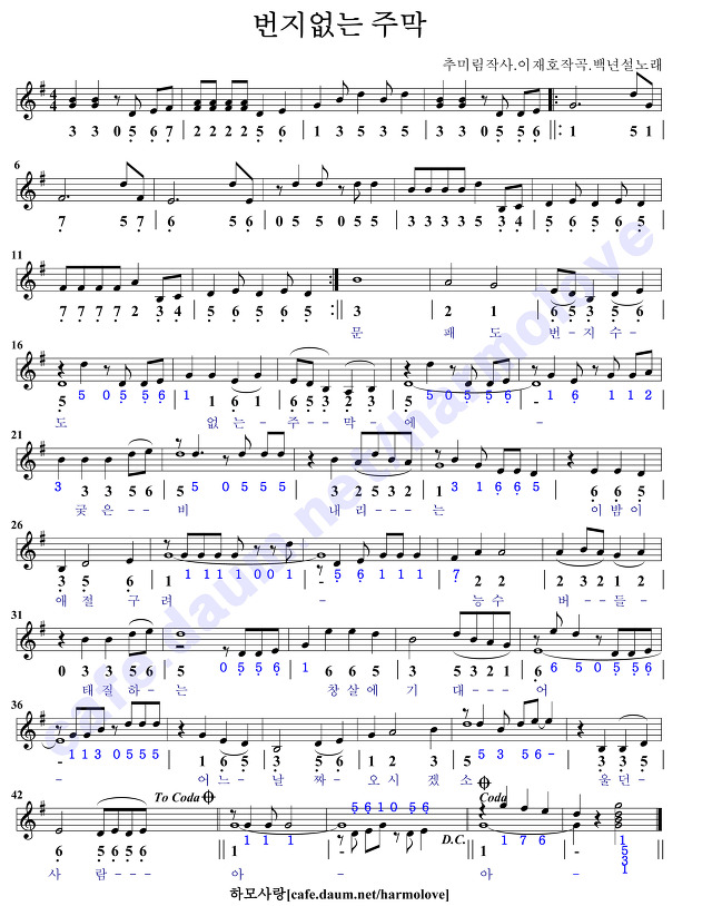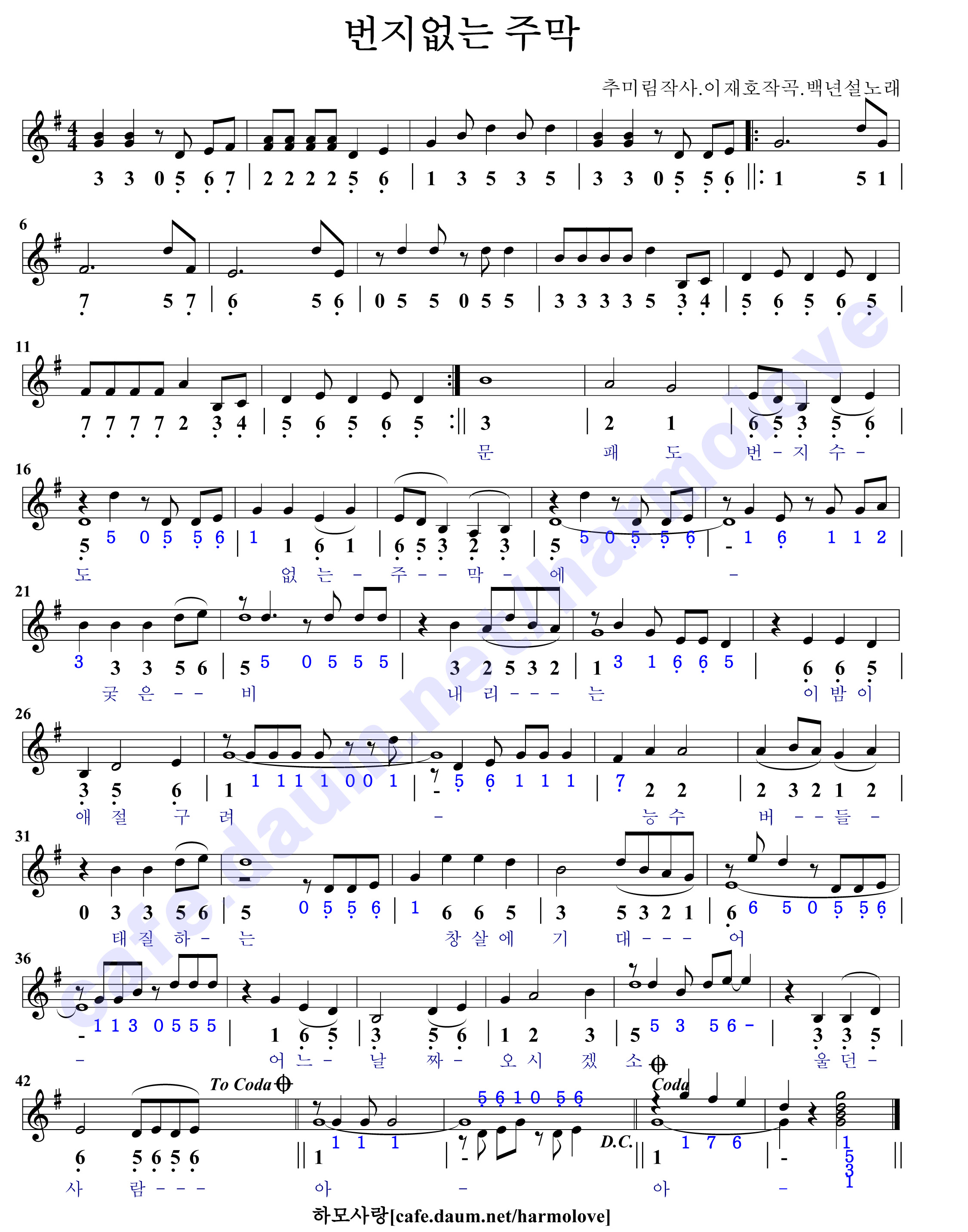 [스크랩] 번지없는 주막 작성자송인영|작성시간11.11.19|조회수607 목록 댓글 0 글자크기 작게가 글자크기 크게가 번지없는 주막 - 하모니카 연주용 악보입니다. [G 키] 번지없는주막w.jpg 다음검색 스크랩 원문 : 하모사랑 현재 게시글 추가 기능 열기 북마크 공유하기 신고 센터로 신고 댓글 댓글 0 댓글쓰기 답글쓰기 댓글 리스트