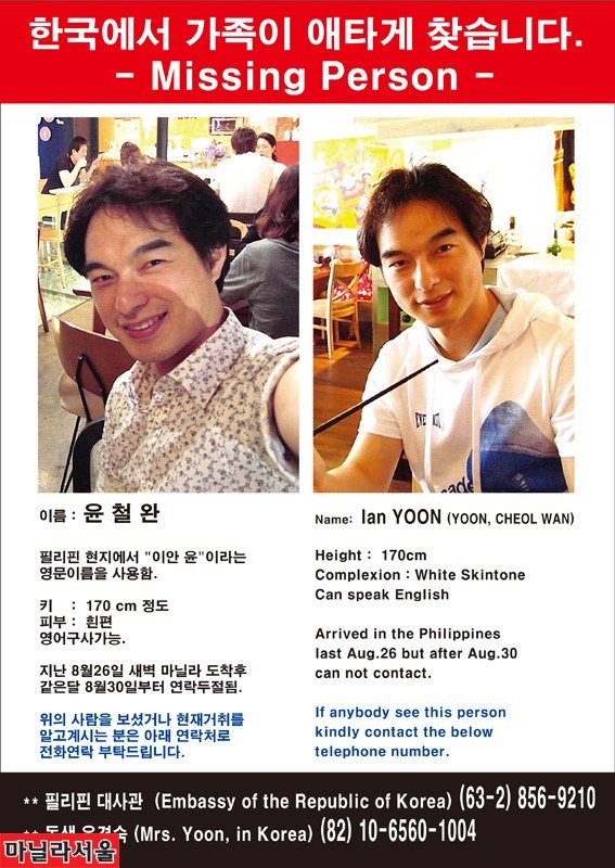 30대 공군중령이 필리핀으로 여행 왔다가 돌연 실종돼 가족들이 애타게 기다리고 있다. 실종자 가족들에 따르면 윤철완(74년생)씨는 작년 8월25일(수) 세부 퍼시픽 195편을 타고 마닐라에 도착, 8월29일까지 마닐라에 머물면서 가족들과 연락을 수시로 하고 지내던 도중 갑자기 실종됐다. 윤철완씨는 실종 당시 한국에 있는 동생 윤경숙씨에게 자신의 핸드폰이 아닌 다른 핸드폰으로 신용카드를 분실했다고 말하며 한국에 있는 또 다른 신용카드 앞∙뒤 면을 스캔해 이메일로 보내주면 사용할 수 있다고 전화통화를 한 것으로 알려졌다. 동생 윤경숙씨는 오빠 윤철완씨의 신용카드 2개를 스캔해 이메일로 발송한 후 다시 전화통화를 시도했으나 '받을 수 없다'는 멘트를 전해 들었다고 한다. 이 후부터 오빠 윤철완씨와의 연락이 불가능 했으며 8월30일 윤철완씨 신용카드 2개를 이용한 카드론 현금 서비스로 총 3460만원이 대출된 것으로 확인됐다. 윤철완씨는 집안의 5대 독자로 태어나 공군사관학교를 졸업하고 공군중령으로 지내다가 2009년 예편했으며 미국으로 건너가 간호사가 되기 위해 공부를 하던 중 잠시 머리를 식힐 겸 필리핀으로 여행 온 것으로 알려졌다. 동생 윤경숙씨는 오빠 윤철완씨가 영어실력이 월등해 항상 저렴한 가격으로 여행을 다녔으며 여행을 다닐 때는 매일 또는 이틀에 한번 꼴로 지속적인 이동경로 및 하루 일과 등을 페이스북이나 지인과의 메신져를 통해 전했다고 말했다. 또한 윤철완의 평상시 소비행태를 보아 카드론을 쓸 성격이 아니며 혹 경비가 부족하다면 차라리 지인들에게 소액 송금을 받아 쓰는 편이라고 했다. 동생 윤경숙씨는 "이번 일이 생기고 나서 연세가 90세가 되신 할머니가 몸 져 누워 계시고 아버지는 다니던 직장까지 그만두고 오빠를 찾기 위해 동분서주하고 계신다. 가정의 평화를 위해 항상 미소를 잃지 않으셨던 어머니 또한 눈물로 하루하루를 보내고 있다"며 찢어지는 마음을 전달했다. 그녀는 본지에 "제발 지면을 통해 많은 분들의 온정으로 오빠의 행방을 하루속히 알 수 있었으면 좋겠다. 가족의 품으로 무사히 오빠가 빨리 돌아왔으면 좋겠다"고 애타게 도움을 요청했다. 용의자 2명 중 1명 인적사항 파악∙∙∙현재 잠적상태 주필대한민국대사관 정 영사는 윤씨의 실종사건을 한국과 필리핀과의 공조로 경찰수사에 총력을 기울이고 있다고 밝혔다. 정 영사는 윤씨의 실종이 범죄가 개입돼 있다며 "윤씨의 신용카드 계좌를 추적하니 가명으로 된 다른 사람 이름으로 인터넷 뱅킹이 이뤄졌다"고 말하고 "이번 실종 사건의 범인은 매우 지능적인 수법을 사용했다"고 덧붙였다. 한편 이번 사건을 담당하고 있는 인천계양경찰서 강력계 권광훈 팀장은 "국내 전국 계좌를 모두 조사해 윤씨 실종사건의 유력 용의자 2명 중 1명의 인적 사항을 파악했다"고 밝혔다. 용의자는 이미 국내에서 수배 중인 상태이며 용의자로 인해 국내 피해 사건만 해도 10건이 넘는다고 한다. 용의자는 수배령이 떨어지기 전, 2006년 필리핀으로 도주했으며 필리핀에서도 거주 한인에게 700만원 상당의 피해를 입혀 고소를 당했으나 보석금으로 풀려났다고 전했다. 강력계 권광훈 팀장은 용의자를 잡기 위해 계속해서 추적 중이라고 했으나 대사관 경찰영사는 용의자는 이미 잠적한 상태라고 말했다. 마닐라서울 취재부
