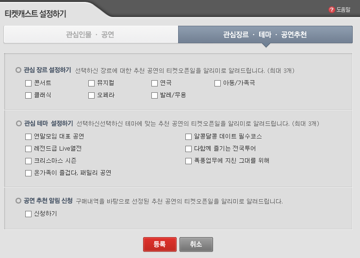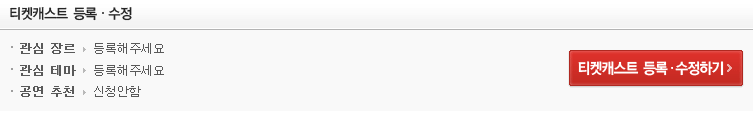 Tip) [티켓캐스트 등록 · 수정하기]를 클릭하면 [관심장르 · 테마 · 공연추천]에 대한 티켓캐스트도 설정할 수 있습니다.