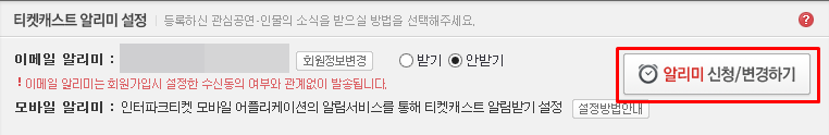 4. 티켓캐스트 알리미 설정 [알리미 신청/변경하기] 클릭한다. 신청완료!