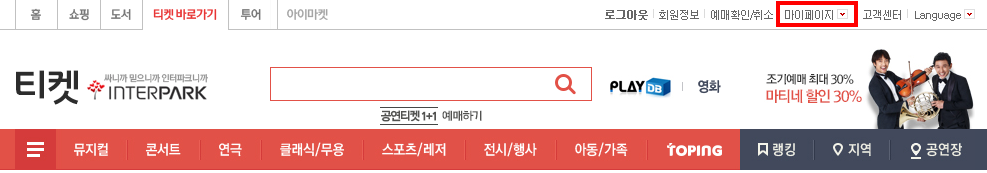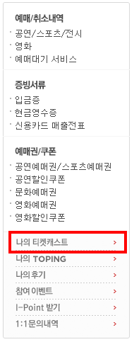 2-B. 마우스 롤오버 시, 드롭다운 메뉴에 있는 [티켓캐스트]를 눌러주세요.
