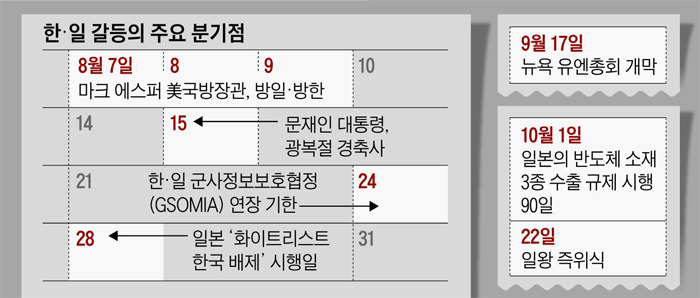 지소미아 연장 거부 시한(8월 24일) 나흘 뒤인 28일엔 일본의 '화이트리스트 내 한국 배제'가 시행된다. 국내 산업계는 이후 한·일 무역 갈등의 향방을 가늠할 날로 '10월 1일'을 꼽고 있다. 일본이 반도체 등 핵심 소재 3종의 수출 규제를 시행한 지난달 4일로부터 90일째 되는 날이다. 반도체 업계 관계자는 "일본이 수출 심사 기간을 약 일주일에서 90일로 늘렸는데, 10월 1일 전 수출 허가가 어떻게 나오는지 봐야 대책을 세울 수 있을 것"이라고 했다.