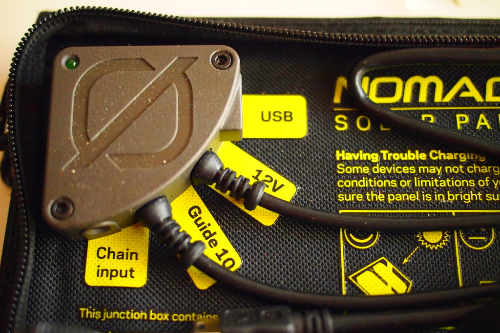 Features: Solar Capacity: 7W Power Output: USB, 12V Ideal for: Guide 10, Switch 8, Smartphone, GPS, Headlamp Weight: 0.8 lbs Chainable: Yes Cell Type: Monocrystalline