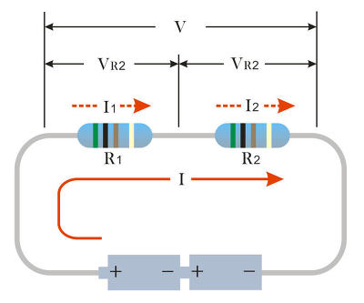 전체 전압 V = VR1 + VR2 = (I × R1) +(I × R2) = I × (R1+R2) 가 된답니다.