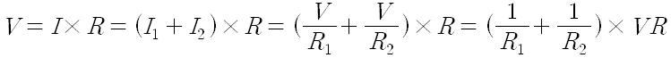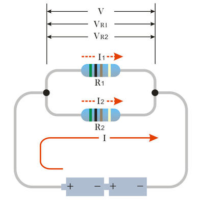저항 R1과 저항 R2에 걸리는 전압 V는 동일하므로 각각의 저항에 걸리는 전압은 모두 같은 값이 되므로