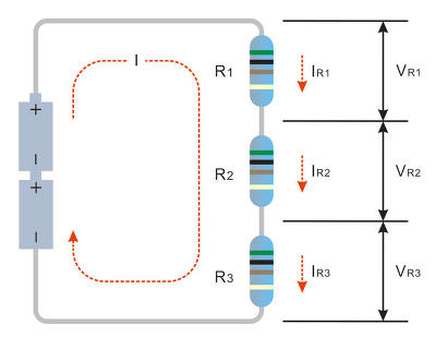 전체 전압 V는 각각의 저항에 걸리는 전압을 모두 더한 값이 되므로 전체 전압 V = VR1 + VR2 + VR3 이 되지요.