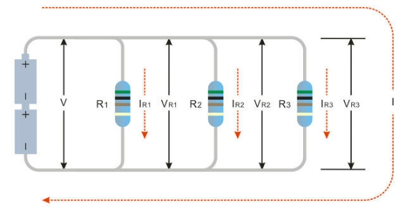 회로에 공급된 전압은 항상 일정하므로 V = VR1 = VR2 = VR3 이 된답니다.