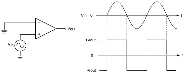 입력 단자에는 비교되어야 할 전압을 입력하여 전압의 차를 내부 차동증폭기로 증폭하여, 디지털 신호인 High