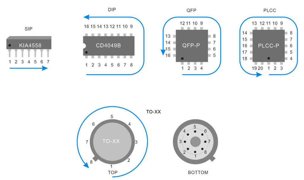 사각형 플라스틱 패캐지 IC는 점을 찍어 1번 핀을 지시하는 반면, 원형 TO-XX 타입은 작은 돌출부를 만들어서 끝번 핀을
