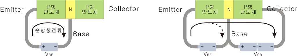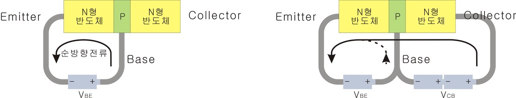 베이스와 에미터의 순방향 전압 공급과 전류 흐름                베이스와 콜렉터의 역방향 전압 공급과 전류 흐름