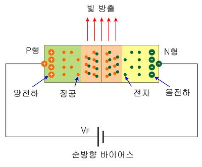 P-N 접합 LED에 순방향 전압을 인가하게 되면, N 형 반도체 영역의 전자가 외부에서 공급되는 전류에 의해