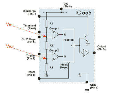 여기서, 트리거 입력 전압이 기준 전압 VR2보다 낮으면 비교기 출력은 “HIGH”, VR2 보다 높으면 “Low” 상태로 출력을