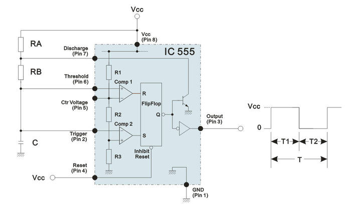 IC 555와 같이 구성된 회로에서 생성되는 타이밍 펄스는 IC 555와 연결되는 저항값과 케패시터 값을 이용해