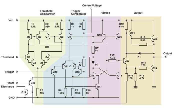 IC 555의 내부 회로(눈으로만 참고하세요....)는 다음과 같답니다.