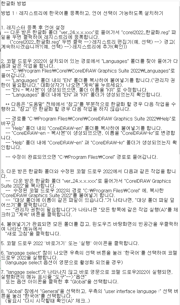 오늘 추가로 다시 코렐2023을 설치해서 한글화를 다시 해 보았으나 되지가 않았습니다