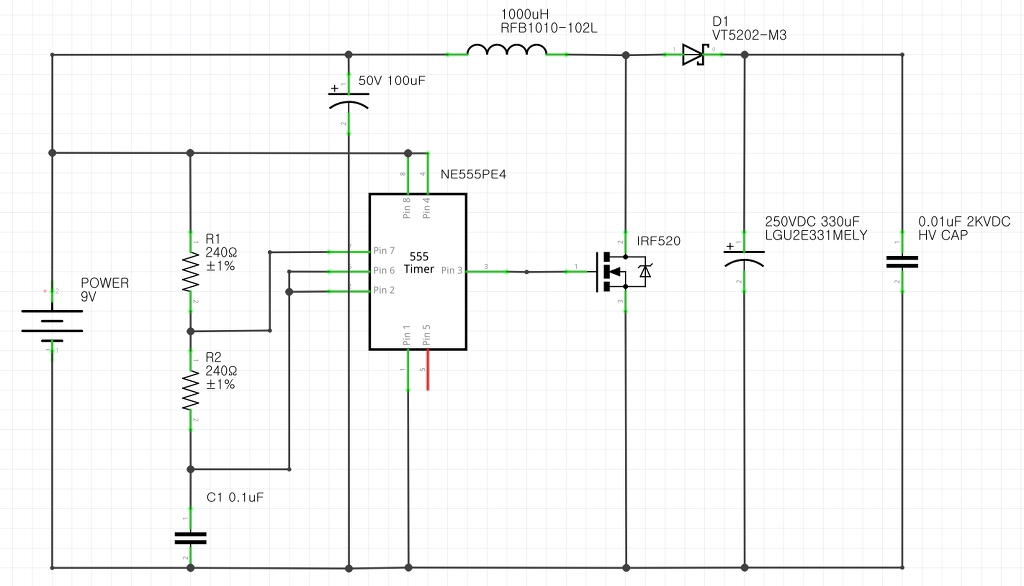 555타이머로 신호를 만들어 내고 그 신호를 이용해 승압을 하는 회로를 짰습니다.