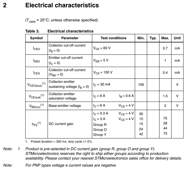 제일 하단의 hfe값은, 컬렉터-이미터 사이에 4V 0.3A를 걸었을 때 30A, 4V 3A를 걸었을 때 15~75A가 된다는 뜻인가요,