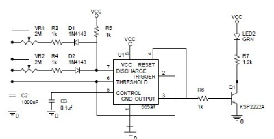 전원이 공급되면 다이오드 D1, 저항 R3, VR1으로 구성된 충전회로에 의해 캐패시터 C1이 충전을 시작하게 되고, 555 IC 핀 6(THRESHOLD)와 연결된 캐패시터의 충전전압이 공급전압의 2/3 Vcc가 되면 555 IC는 출력을 Low 상태로 전환하게 된답니다.