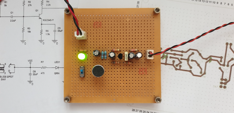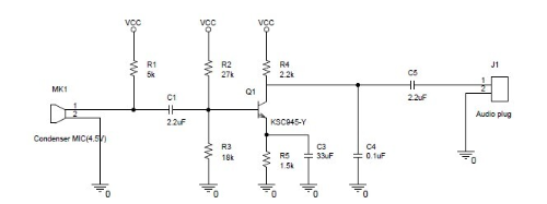 회로는 콘덴서 마이크의 신호를 증폭하기 위해 A급 증폭기를 적용하였고, 공급 전원은 5Vdc~6Vdc, 증폭기는 소신호용으로 10mA 정도 출력 전류를 공급하는 트랜지스터와 주변 회로(저항과 콘덴서)로 구성하였습니다.