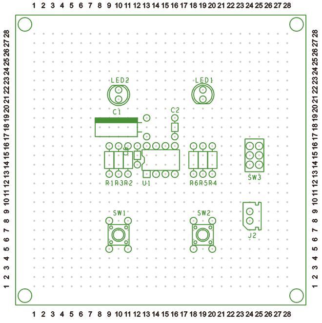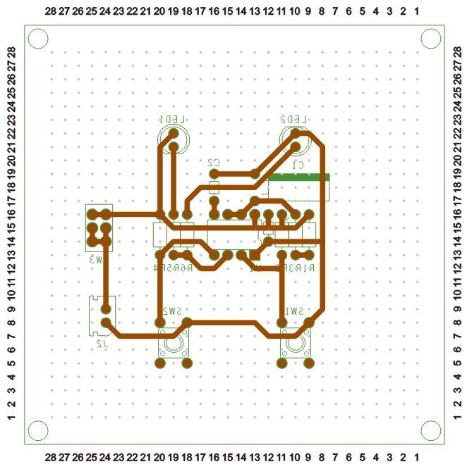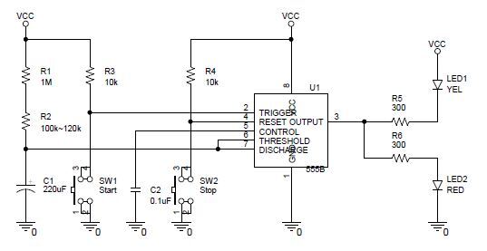 스타트 스위치 SW1을 누르면 555 IC에 트리거 신호가 입력되어 IC 내부 회로와 저항과 콘덴서에 의해 결정된 동작주기 동안 출력을 내보내게 되어 황색 LED2는 꺼지고, 적색 LED1이 켜지게 된답니다.
