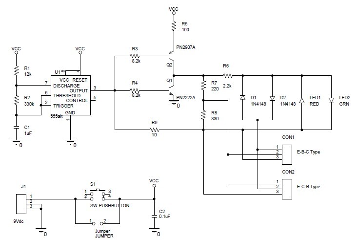 회로도에 보면 위쪽에 EBC Type , 아래쪽에 ECB Type을 꽂는 곳이있는데 이것과 상관없이 NPN형 트랜지스터를 꽂으면 똑같이 녹색 점멸, PNP형 트랜지스터를 꽂으면 빨간색 점멸하던데