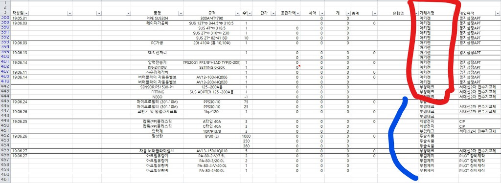 거래처명에서 빨간색을 기준으로 필터를 적용하였는데 파란색이 같이 검색됩니다.