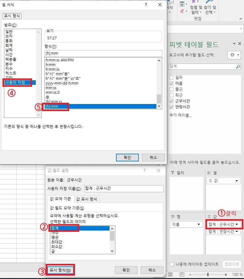 Re: 연장근로시간 개인별 합 구하기 작성자마중물|작성시간20.12.24|조회수435 목록 댓글 0 글자크기 작게가 글자크기 크게가 피벗테이블 '값 필드 설정'에서 필드의 데이터를 '합계'로 선택하고, 표시형식을 클릭하고, 사용자 지정에서 ' [h]:mm'으로 선택하면 원하는 값을 얻을 수 있습니다. 다음검색 현재 게시글 추가 기능 열기 북마크 공유하기 신고 센터로 신고 댓글 댓글 0 댓글쓰기 답글쓰기 댓글 리스트
