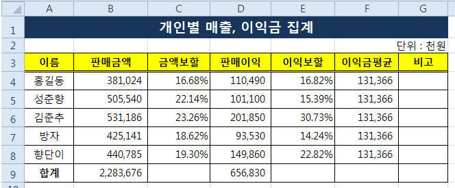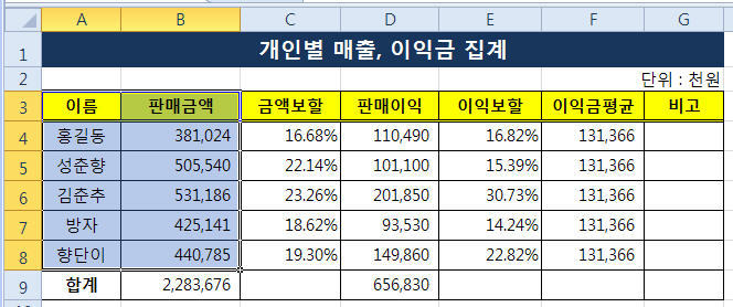 그렇다면 이름과 판매금액이 나타나있는 [A3:B8]셀을 선택합니다.