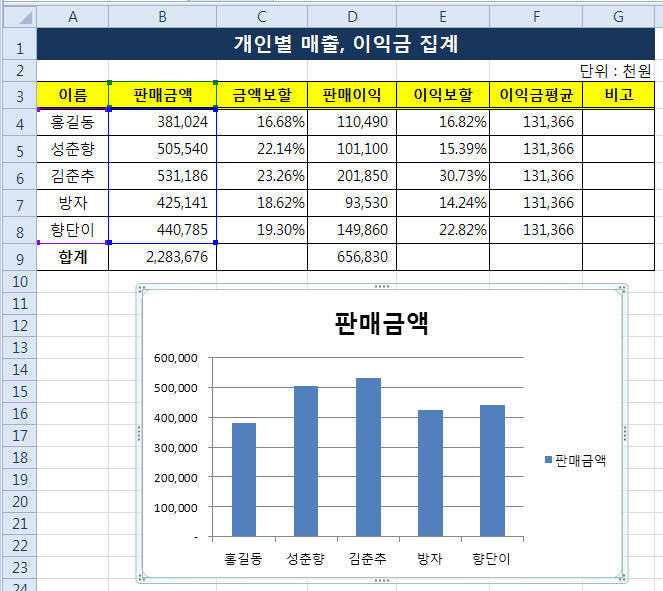 아래와 같이 개인별 판매금액을 나타내 주는 차트가 생성된것을 확인할 수 있습니다.