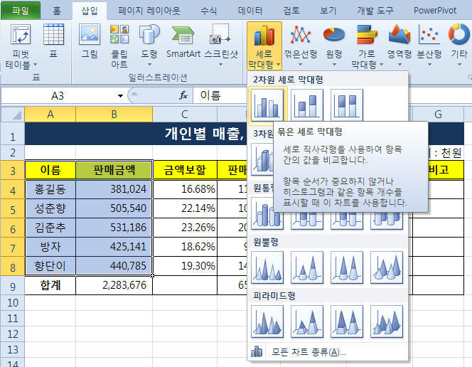 개인별 판매금액을 나타내는 2차원 세로 막대형 차트를 작성하려고 합니다.