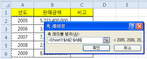 [축 레이블] 대화상자에서 [축 레이블 범위]를 마우스를 이용해서 [A2:A6]셀을 선택하고 [확인] 버튼을 클릭합니다.
